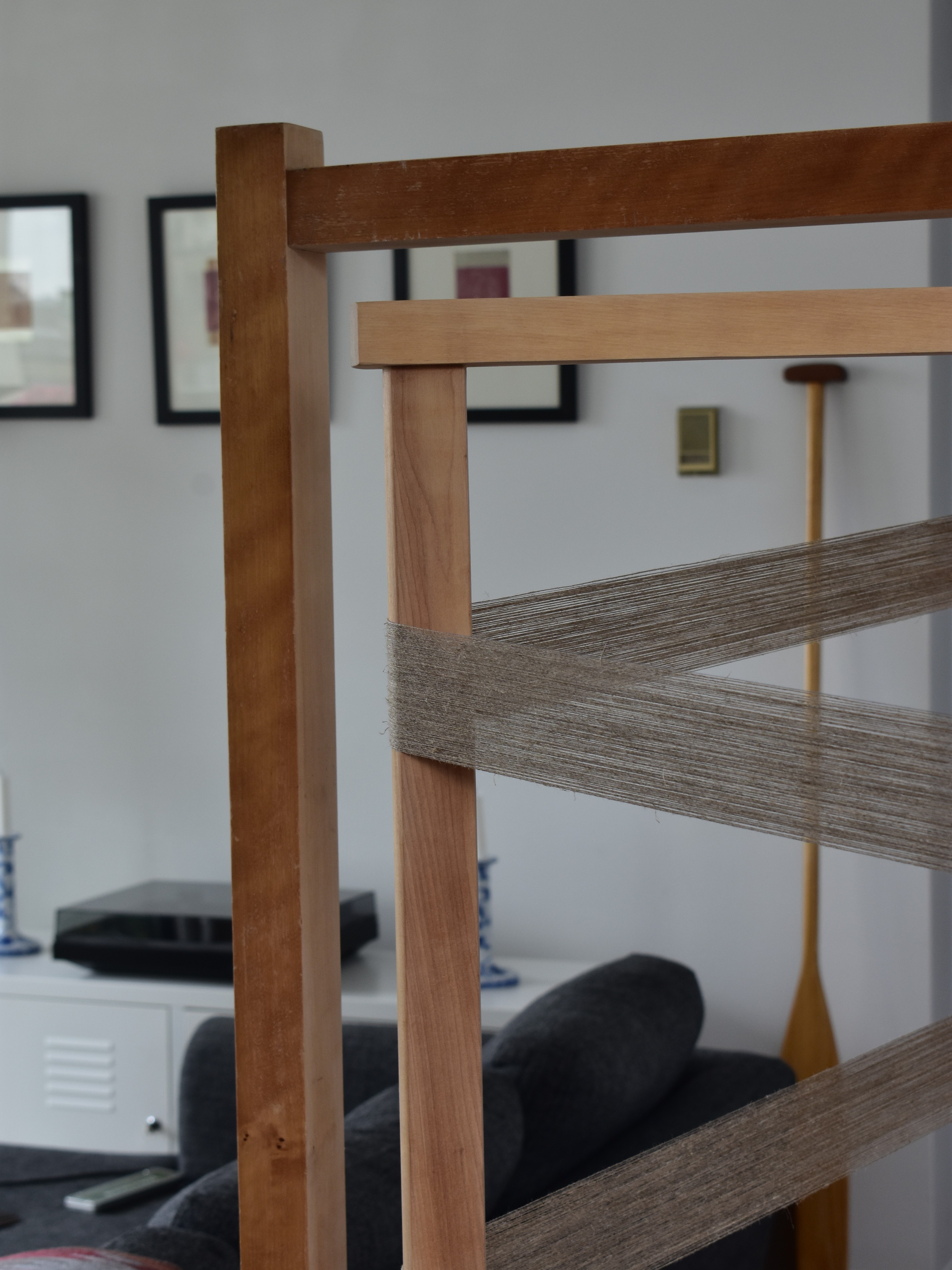 The materials in TWO PLACES AT ONCE were thoughtfully chosen to reflect the tension between local and global systems. Just as the piece explores contrasts, so too do the materials: soft and rough, smooth and fuzzy. The warp is an undyed #10 tow linen. The weft combines an eggplant mohair (industry surplus from my previous neighbour, who was a yarn distributor) with a lime tartan wool (waste yarn from a twill sampler I wove earlier in the year). Together, these contrasting textures, colors, and fibers find harmony through their interlacement, creating a visual and tactile representation of balance.